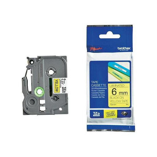Ламинированная клеящаяся лента Brother TZe-611 (6 мм) для принтеров Brother P-Touch. Чёрный шрифт на жёлтом фоне. Надпись наносится на нижнюю сторону защитного слоя по технологии термопереноса. Подробнее